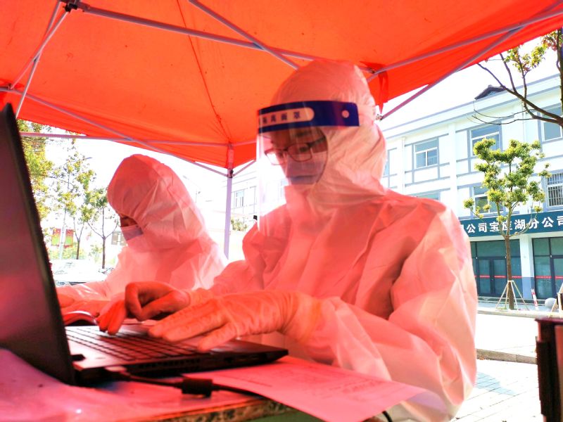 在寶應(yīng)湖農(nóng)場固定核酸檢測點,有這樣一群人,他們身穿白色防護服忙著測溫掃碼、維持秩序、采集信息……,“您好請掃一下場所碼,近期沒有外出吧?”“您好,我給您測量一下體溫”“請大家保持一米線,核酸做完及時離開,不交談不聚集”一句句叮囑傳遞著疫情期間的濃濃關(guān)懷,在大家的耳畔久久回蕩。