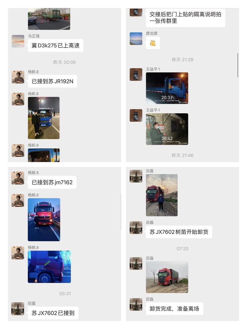 “冀D3k275已上高速”“已接到蘇JR192N”“空車回場(chǎng),行程碼無(wú)星號(hào),居家隔離”“蘇JX7602樹苗開始卸貨”……弶港農(nóng)場(chǎng)“疫”線黨員突擊隊(duì)微信群里的工作匯報(bào)內(nèi)容簡(jiǎn)短,工作流程圖像清晰,值班人員和應(yīng)急小組24小時(shí)在線,全力為場(chǎng)域內(nèi)企業(yè)企業(yè)穩(wěn)產(chǎn)保供保駕護(hù)航。