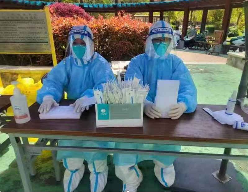 一日為醫(yī),終生不棄。張紅主動(dòng)擔(dān)當(dāng)國企的責(zé)任與使命。4月4日凌晨6點(diǎn)趕到上海浦東新區(qū)川沙鎮(zhèn)社區(qū),醫(yī)務(wù)人員相互之間穿戴好防護(hù)服、護(hù)目鏡、口罩、鞋套、手套、帽子,并進(jìn)行嚴(yán)而又嚴(yán)、實(shí)而又實(shí)、細(xì)而又細(xì)的防護(hù)檢查,沒有休息片刻就立即投入核酸采集的戰(zhàn)斗中。浦東新區(qū)疫情形勢嚴(yán)峻,面對被感染的風(fēng)險(xiǎn)和高負(fù)荷的工作壓力,張紅有條不紊地進(jìn)行核酸檢測采集工作。這是上海浦東新區(qū)全民核酸檢測第三天,也是核酸采集壓力最大的一天,采集現(xiàn)場的布置、醫(yī)護(hù)人員與新設(shè)備的磨合、工作人員與社區(qū)、居委會(huì)人員的協(xié)調(diào)、居民采集核酸的急迫心情等,多重矛盾交織在一起。對此,張紅和其他醫(yī)務(wù)人員爭分奪秒抓緊進(jìn)行核酸檢測,炎熱的天氣、高強(qiáng)度的工作加之憋悶的防護(hù)裝備,衣衫不停的被汗水浸濕,再被身體烘干,再浸濕……臉部深深的壓痕成了標(biāo)配,人在汗水“泡”著里工作成了常態(tài)……到了晚上,為了緩解上海市疫情防控壓力,張紅又和同事們一起乘上大客車連夜返回到響水,趕到響水時(shí)已是4月5日凌晨1點(diǎn)多了。第一趟完成核酸檢測任務(wù)連續(xù)30個(gè)小時(shí)不吃不喝,張紅不言苦、不叫累。她堅(jiān)持以高度的責(zé)任心為前來做核酸檢測的人員提供服務(wù),她用真情和愛心譜寫著平凡而動(dòng)人的天使之歌!