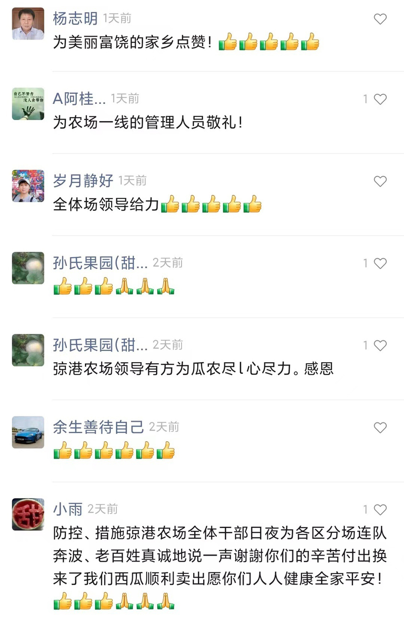 西瓜場(chǎng)來(lái)臨正值疫情防控形勢(shì)最嚴(yán)峻的時(shí)候,按照上級(jí)疫情防控要求,弶港農(nóng)場(chǎng)黨委制定出防控西瓜運(yùn)銷車輛閉環(huán)管理工作方案,成立西瓜運(yùn)銷“疫”線指揮部,設(shè)立八個(gè)工作專班,近百人的西瓜閉環(huán)運(yùn)銷隊(duì)伍,日夜奮戰(zhàn),全程嚴(yán)密管控西瓜運(yùn)銷貨車閉環(huán)管理,確保全國(guó)各地貨車開得進(jìn)來(lái),農(nóng)場(chǎng)職工西瓜賣得出去。在這場(chǎng)戰(zhàn)役中,全場(chǎng)廣大黨員干部在抗“疫”一線“佩黨徽、亮身份、做表率”,以“一名黨員一面旗幟”的良好形象,全力以赴,吃苦在前、沖在一線,弶港農(nóng)場(chǎng)2萬(wàn)多噸“弶農(nóng)”牌西瓜順利銷售。“美麗弶農(nóng)”視頻號(hào)上反映西瓜運(yùn)銷工作的小視頻,7千多次瀏覽量,幾百人點(diǎn)贊轉(zhuǎn)發(fā),閉環(huán)運(yùn)銷工作得到廣大職工群眾的一致稱贊,公司黨委書記胡廣斌在工作群中感嘆道“得到群眾的好評(píng)不容易”。