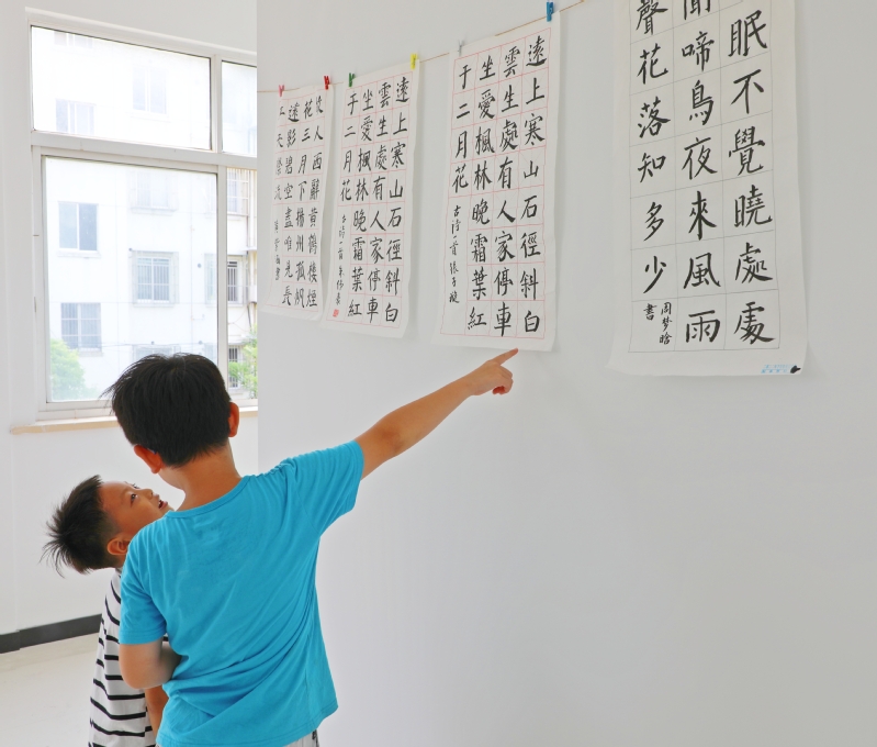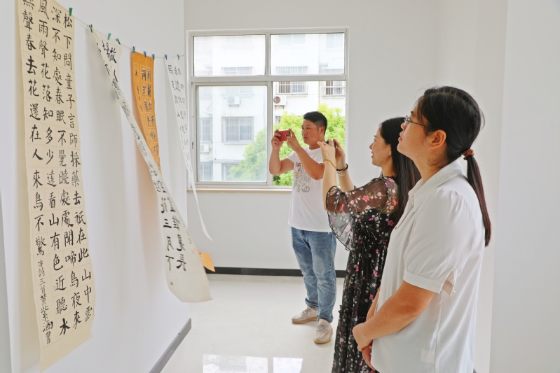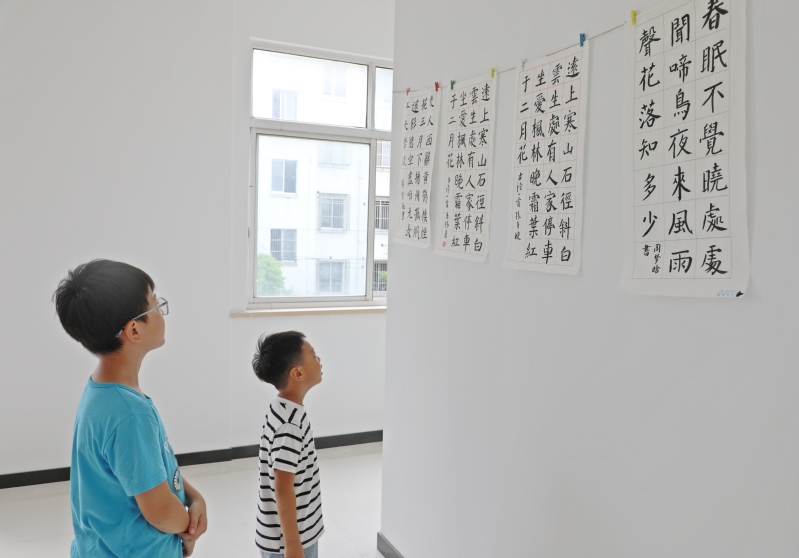 8月28日,在江心沙職工書(shū)屋二樓,一場(chǎng)為期一周,象征著收獲的青少年書(shū)法展,吸引了不少職工居民和學(xué)生前來(lái)觀覽。圖為“書(shū)迷”們觀摩“暑期公益課堂·書(shū)法班”“結(jié)業(yè)”作品的溫馨場(chǎng)景。