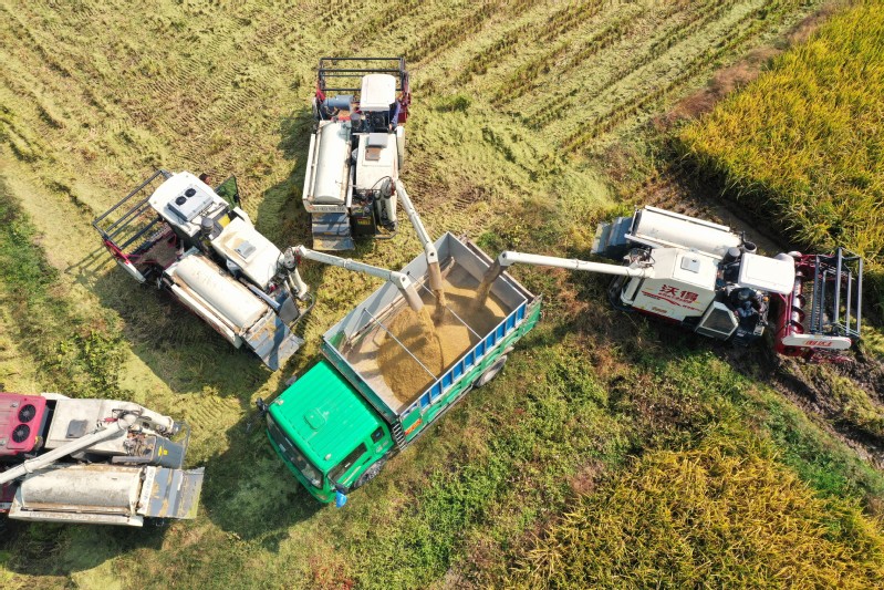 10月17日,寶應(yīng)湖農(nóng)場(chǎng)5萬(wàn)畝稻田開(kāi)鐮試割。三四臺(tái)收割機(jī)來(lái)回穿梭、相互協(xié)作,粒粒飽滿(mǎn)的水稻收割脫粒,很快就被裝進(jìn)運(yùn)輸車(chē)?yán)?,隨后運(yùn)送至場(chǎng)頭過(guò)磅晾曬。農(nóng)技人員穿梭在剛收割完畢的田塊里,根據(jù)收割機(jī)的實(shí)際收割質(zhì)量,進(jìn)行指揮調(diào)整,把“豐收在望”變成“豐收在手”。