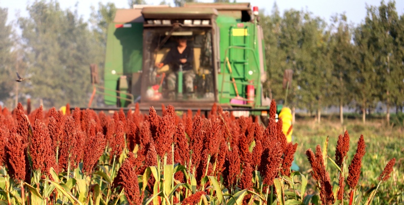 火紅,也是豐收的顏色。在外拓基地,8400畝酒用高粱進(jìn)入全面收割階段,一輛輛高粱收割一體機(jī)轟鳴著來(lái)回穿梭,一株株穗大粒密的高粱被收割機(jī)納入后吐出,粉碎后的秸稈撒在地里,留下粒粒飽滿(mǎn)的果實(shí),形成了一幅美麗的豐收畫(huà)卷。
