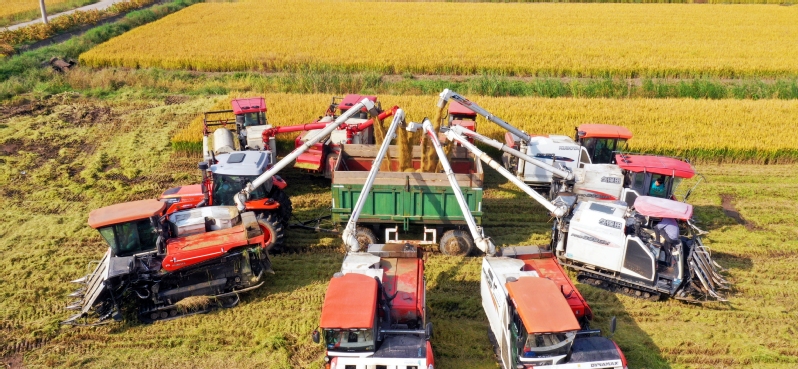 10月25日,蘇墾農發(fā)江心沙分公司搶抓晴好天氣,組織收割機集中開展大規(guī)模水稻收割作業(yè),切實將“豐收在望”轉化為“豐收到手”,彰顯農業(yè)“國家隊”擔當。收割現(xiàn)場,收割機、運糧車來來往往,一片繁忙景象。