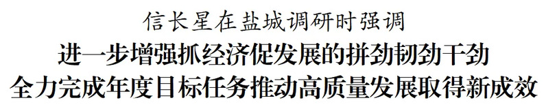 10月28日,省委書記信長星到鹽城市鹽都區(qū)、東臺市調(diào)研。他強調(diào),四季度是全年決勝階段,要深入學(xué)習(xí)貫徹習(xí)近平總書記重要講話精神,錨定年度目標任務(wù),堅定信心、把握機遇,進一步增強抓經(jīng)濟、促發(fā)展的拼勁、韌勁、干勁,推動高質(zhì)量發(fā)展取得新成效,努力為全省發(fā)展大局貢獻更大力量。