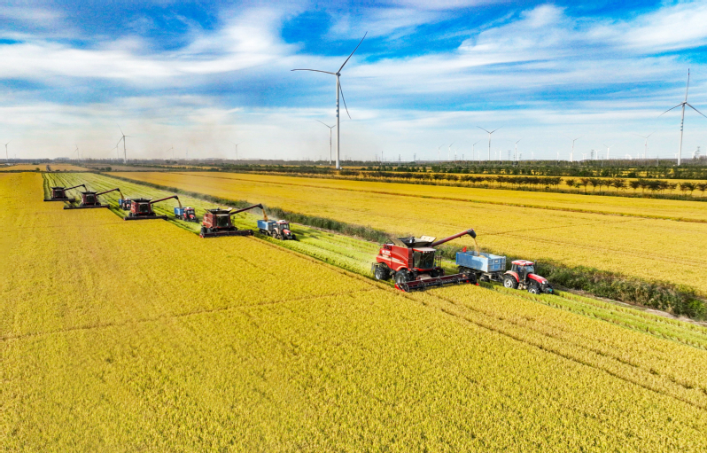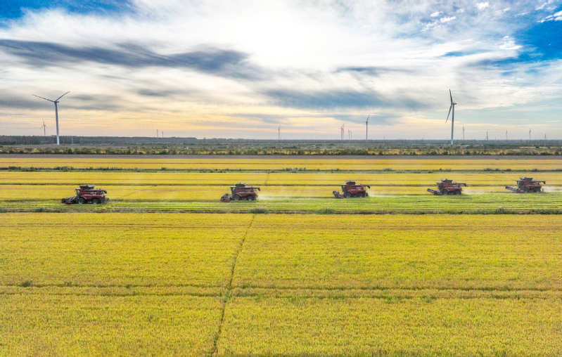 2023年10月28日,在蘇墾農(nóng)發(fā)新洋分公司新南生產(chǎn)區(qū)19大隊的高標準農(nóng)田上,五臺凱斯7088大型聯(lián)合收割機穿梭在稻田中搶收水稻。蘇墾農(nóng)發(fā)新洋分公司搶抓晴好天氣,發(fā)揮農(nóng)墾企業(yè)機械化優(yōu)勢,確保秋糧顆粒歸倉。