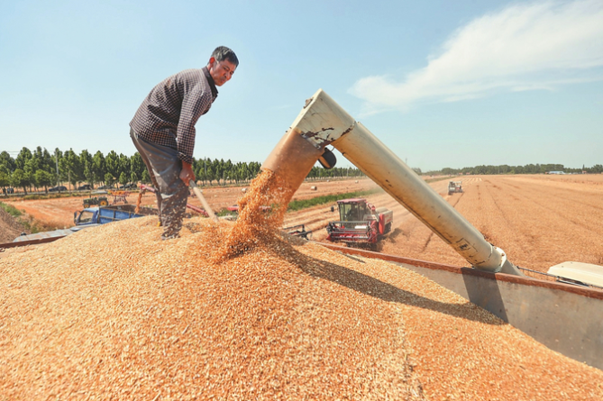 昨日,位于淮安盱眙洪澤湖畔的江蘇農(nóng)墾三河農(nóng)場的3.82萬畝小麥開鐮收割。據(jù)測產(chǎn),三河農(nóng)場今年小麥總產(chǎn)量可達4400萬斤,90%以上將作為優(yōu)質(zhì)種子,供應(yīng)長三角地區(qū)及河南等地。通訊員 許昌銀 本報記者 余萍 攝