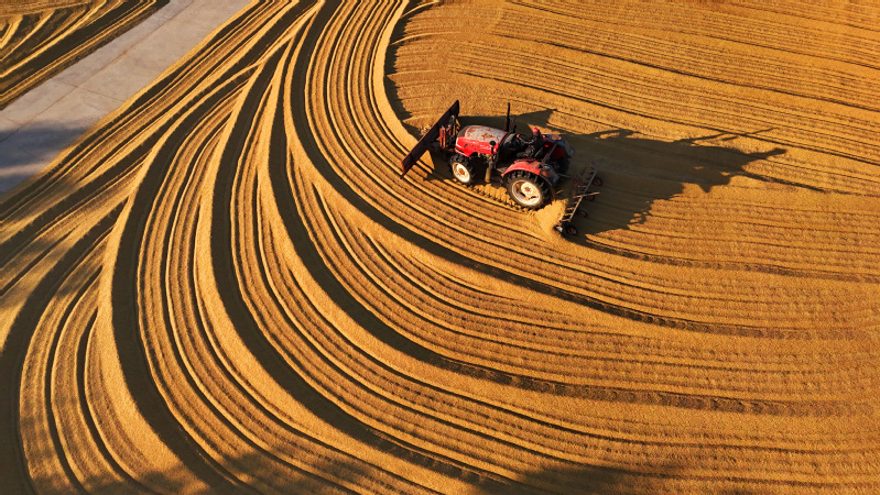 江蘇省連云港市海州區(qū)云臺農(nóng)場工作人員搶抓晴好天氣翻曬稻谷(10月28日攝,無人機照片)?!靶轮瞿噻R面平,家家打稻趁霜晴?!苯鹎飼r節(jié),各地迎來豐收季,農(nóng)民抓住晴好天氣收割收獲晾曬谷類作物,田間地頭呈現(xiàn)一派忙碌的豐收景象。新華社發(fā) 耿玉和 攝
