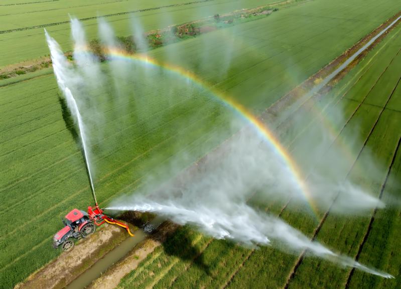 5月2日,正值冬小麥進(jìn)入開花灌漿關(guān)鍵期,江蘇省農(nóng)墾白馬湖農(nóng)場(chǎng)調(diào)集10多臺(tái)噴水機(jī)進(jìn)行分區(qū)抗旱作業(yè),確保近5萬畝冬小麥增產(chǎn)增收。圖為工作人員駕駛噴水機(jī)對(duì)麥田進(jìn)行噴灌作業(yè)。賀敬華 攝 (視覺江蘇網(wǎng)供圖)