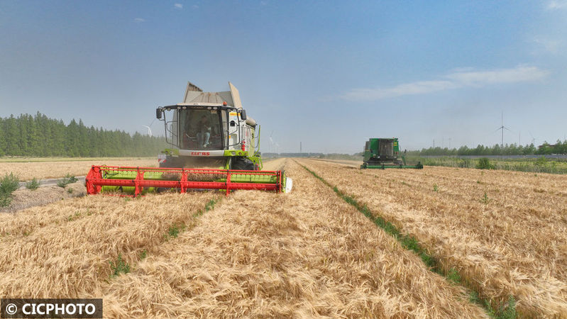 2025年5月20日,聯(lián)合收割機在位于江蘇省鹽城市射陽縣的江蘇農(nóng)墾新洋農(nóng)場大麥田里作業(yè)。CICPHOTO/張偉生 攝