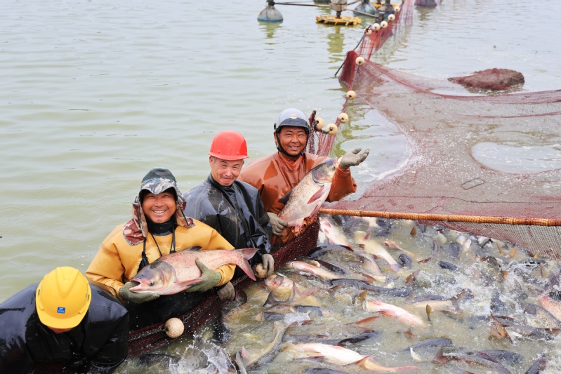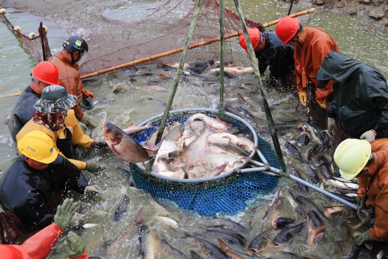 9月15日,江蘇省連云港市海州區(qū)的江蘇農(nóng)墾崗埠農(nóng)場(chǎng),水產(chǎn)工人們?cè)隰~(yú)塘里拉網(wǎng)捕撈分揀花鰱、白鰱等水產(chǎn)品,準(zhǔn)備發(fā)往周邊市場(chǎng)銷(xiāo)售。