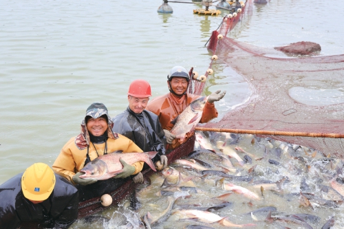 近日,江蘇省連云港市海州區(qū)的江蘇農(nóng)墾崗埠農(nóng)場,工人們在魚塘里拉網(wǎng)捕撈分揀花鰱、白鰱等水產(chǎn)品,準備發(fā)往周邊市場銷售?!?br />
