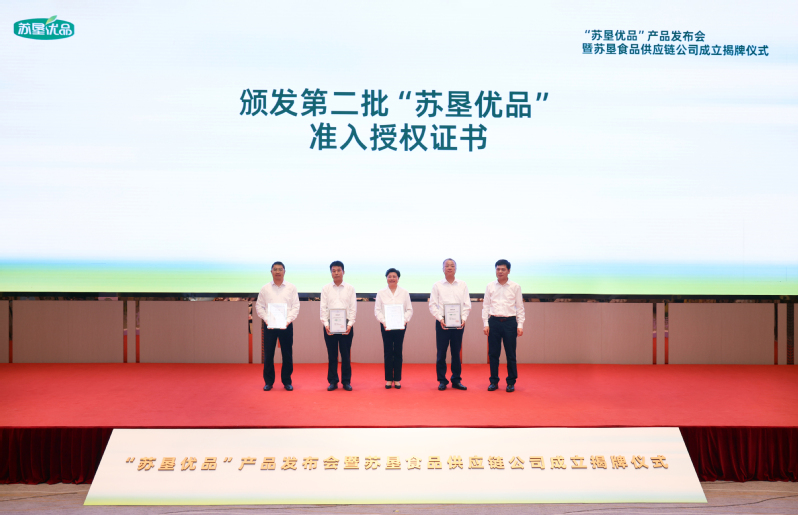 活動(dòng)現(xiàn)場,吳本輝與中山大廈負(fù)責(zé)人共同為蘇墾食品供應(yīng)鏈公司成立揭牌。朱浩為第二批“蘇墾優(yōu)品”生產(chǎn)單位頒發(fā)授權(quán)證書。王立新在致辭中系統(tǒng)闡述了“蘇墾優(yōu)品”產(chǎn)品的價(jià)值定位、市場定位和質(zhì)量保障體系,并介紹了蘇墾食品供應(yīng)鏈公司的組建背景與發(fā)展愿景。