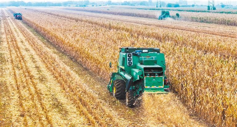 10月15日,農(nóng)機(jī)手駕駛收割機(jī)在江蘇省連云港市云臺(tái)農(nóng)場小汪生產(chǎn)區(qū)田間收割玉米。該市整合63個(gè)烘干中心,295臺(tái)烘干機(jī)開足馬力,日烘干能力可達(dá)1.02萬噸,確保秋糧應(yīng)收盡收。 王健民攝