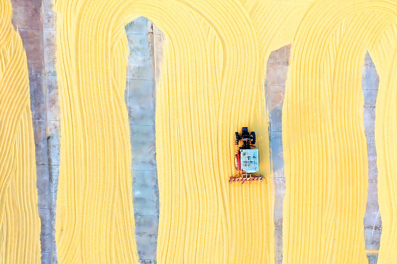 10月27日,連云港市海州區(qū)的江蘇農墾崗埠農場,職工駕駛糧食翻曬機械在場上來回穿梭,翻曬剛剛收獲的水稻。 陶桂軍 嚴連鳳 攝(視覺江蘇網供圖)