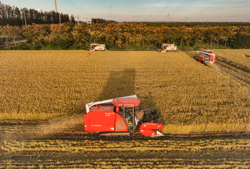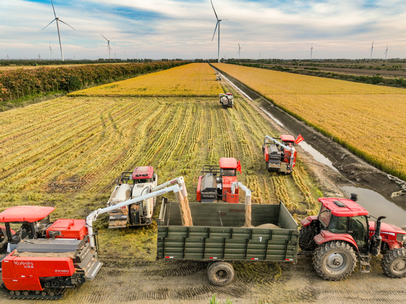 11月3日,江蘇省鹽城市射陽縣新洋農(nóng)場組織收割機械,對高標準農(nóng)田中的優(yōu)質水稻進行搶收作業(yè),確保秋糧顆粒歸倉,不誤農(nóng)時。 作者:張偉生