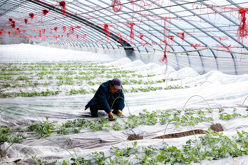 其他大棚里,也滿是搶抓農(nóng)時(shí)的忙碌身影。園區(qū)27號(hào)大棚里,園區(qū)負(fù)責(zé)人魏建東正蹲在甜瓜苗前,仔細(xì)查看它們的長(zhǎng)勢(shì)情況?!稗r(nóng)時(shí)不等人,隨著瓜苗的生長(zhǎng),我們馬上要進(jìn)行打杈、澆水,并進(jìn)行覆膜除草?!蔽航|介紹。打杈是為了去除瓜苗上多余的側(cè)枝,讓養(yǎng)分能夠集中供應(yīng)給主枝和果實(shí),從而提高甜瓜的產(chǎn)量和品質(zhì)。澆水則是根據(jù)瓜苗的生長(zhǎng)需求,適時(shí)補(bǔ)充水分,保證其正常生長(zhǎng)。覆膜除草則可以減少土壤水分蒸發(fā),抑制雜草生長(zhǎng),為甜瓜創(chuàng)造一個(gè)良好的生長(zhǎng)環(huán)境。