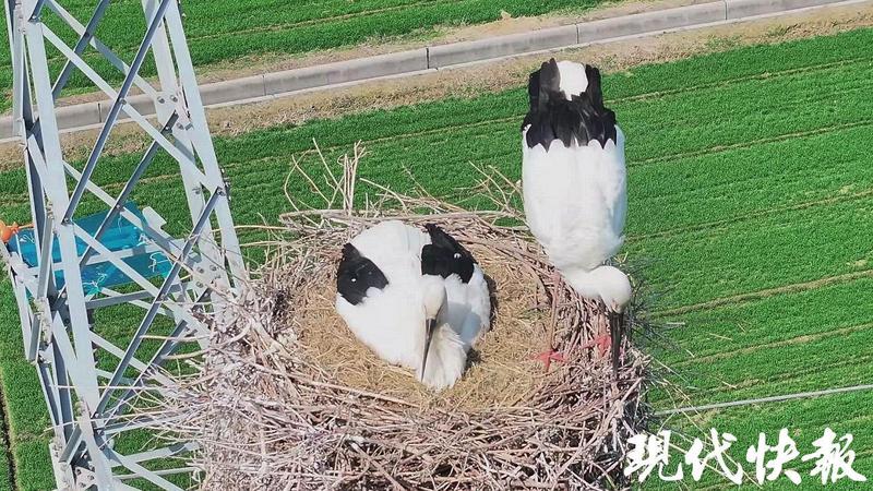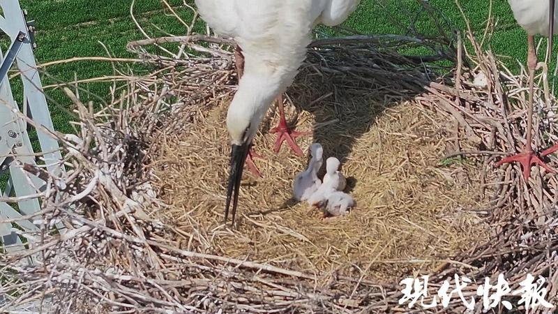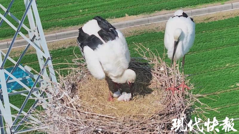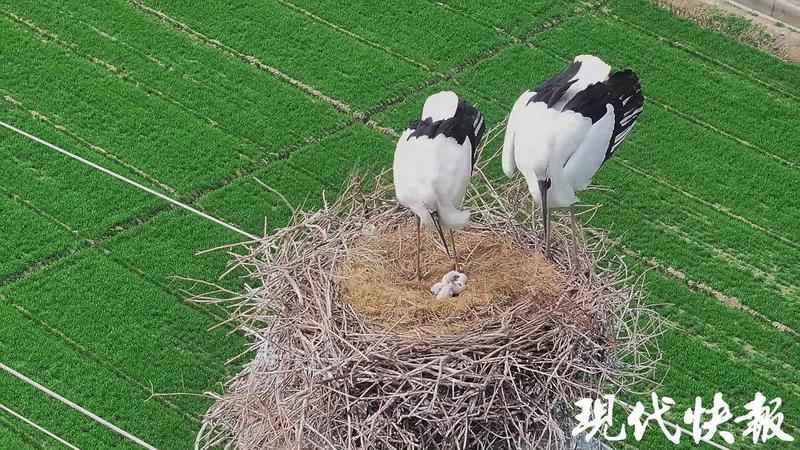3月19日中午,江蘇農(nóng)墾臨海農(nóng)場員工宋婧通過一個多月的耐心蹲守和精心拍攝,成功用無人機航拍技術,全程記錄下國家一級保護野生動物東方白鸛從產(chǎn)蛋、孵化到三只“寶寶”孵化出殼的全過程。