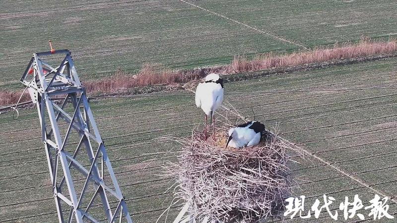 拍攝者宋婧告訴現(xiàn)代快報記者,2月13日中午,她利用中午休息時間,用無人機拍攝麥子的生長狀況時,發(fā)現(xiàn)五分場境內(nèi)的一座高壓線鐵塔上,有大鳥正忙著搭建鳥巢,便立即取出隨身攜帶的無人機,在不驚擾鳥兒的情況下進行拍攝。