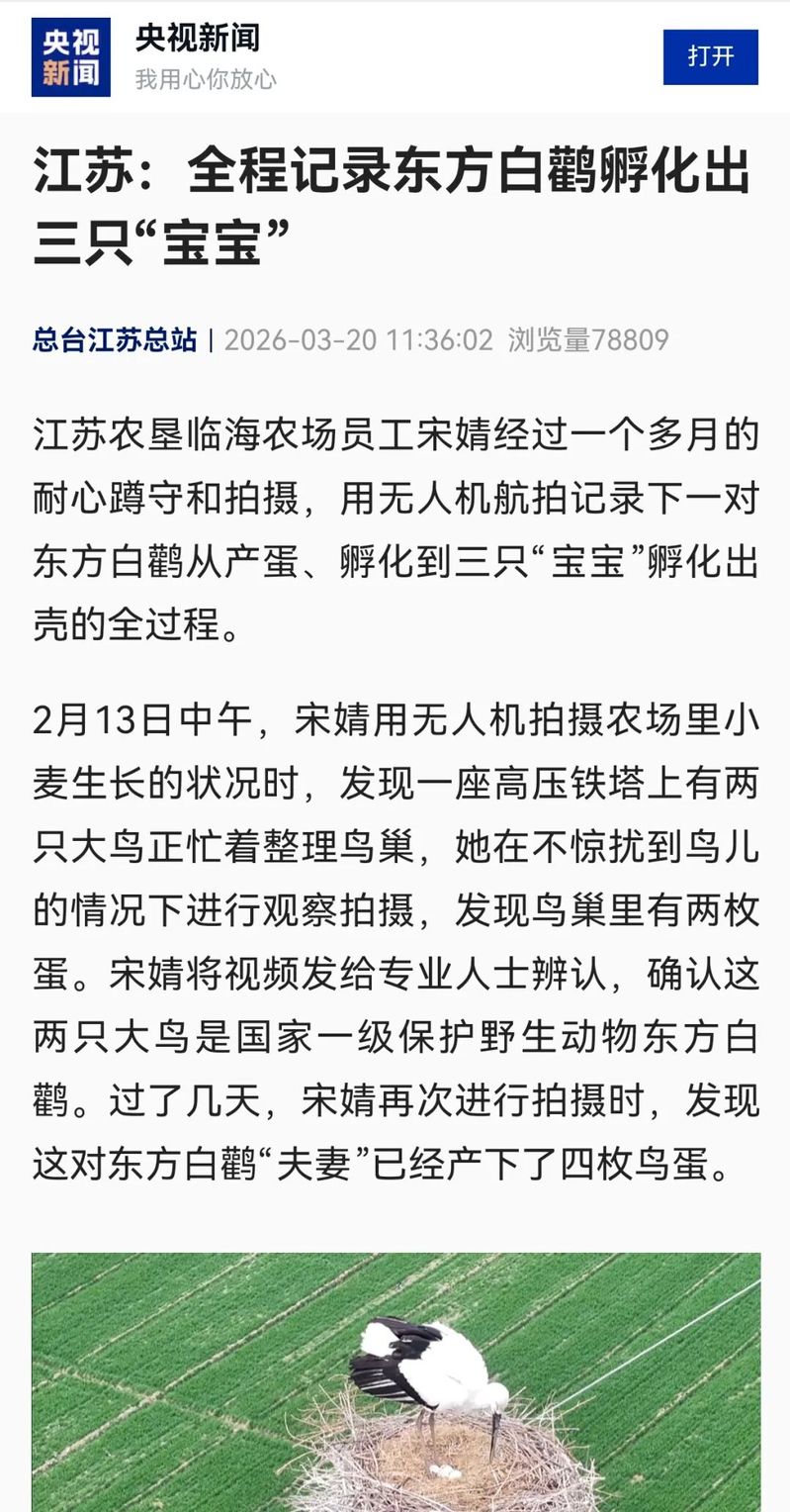 近日,中央電視臺CCTV-13《新聞直播間》、CCTV-2《正點財經(jīng)》、央視新聞客戶端、江蘇新聞等權(quán)威媒體持續(xù)關(guān)注臨海農(nóng)場—— 一對國家一級保護野生動物、被譽為“鳥中大熊貓”的東方白鸛,在此筑巢產(chǎn)卵并成功孵化雛鳥!無人機記錄下東方白鸛產(chǎn)卵、孵化、育雛的完整過程,畫面溫柔治愈,讓臨海農(nóng)場的生態(tài)之美強勢“出圈”。