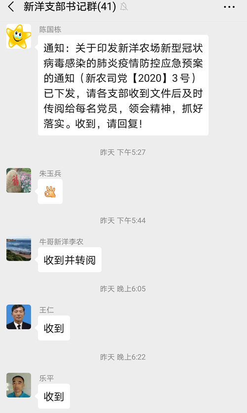 2月6日下午,新洋支部書記群發出《關于關于印發新洋農場新型冠狀病毒感染的肺炎疫情防控應急預案的通