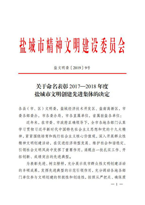 新洋榮獲2017-2018年度“鹽城市文明單位”稱號