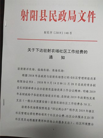 近日,射陽縣民政局下達《關于下達駐射農場社區工作經費的通知》,按照2018年底駐射農場與縣政府簽