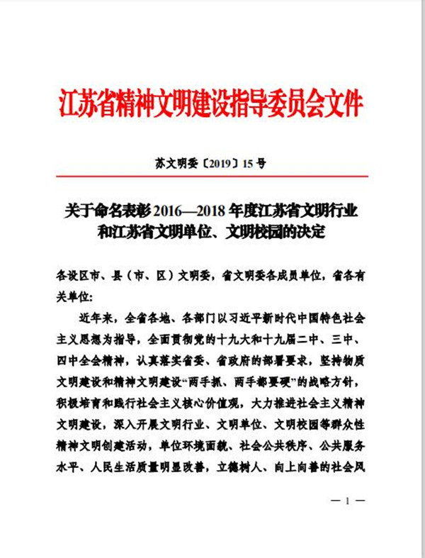2019年12月7日,江蘇省精神文明建設指導委員會發布了《關于表彰2016-2018年度江蘇省文