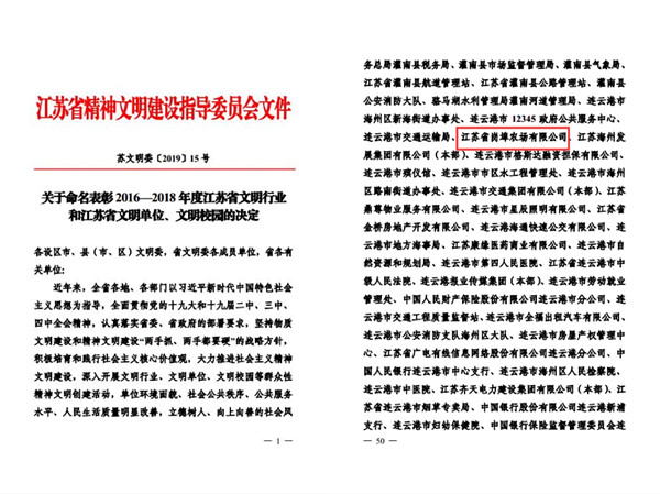 12月7日,江蘇省精神文明建設指導委員會發文表彰2016—2018年度江蘇省文明行業