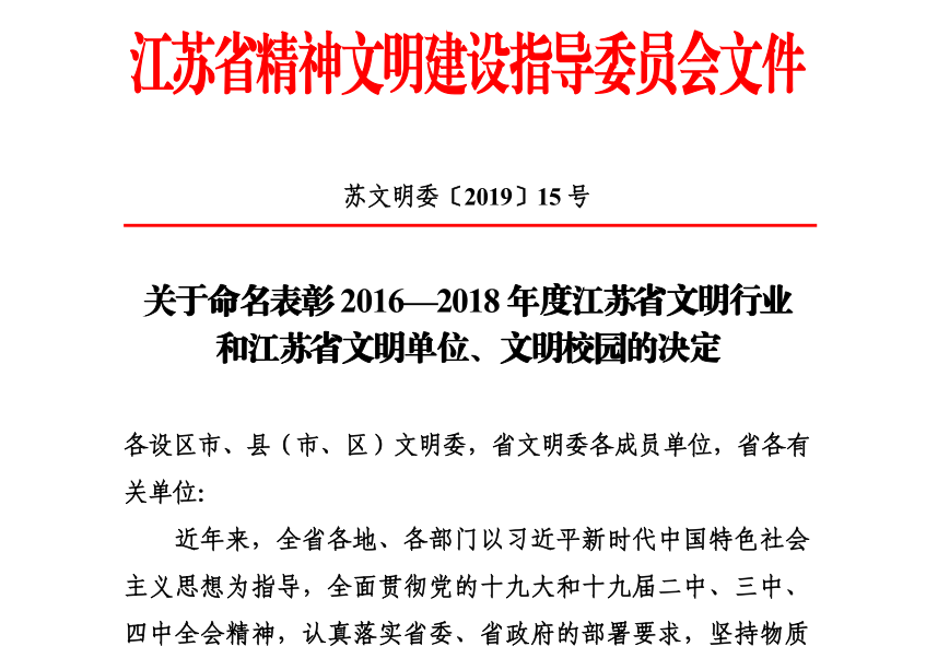近日,江蘇省精神文明建設指導委員會下發《關于命名表彰2016-2018年度江蘇省
