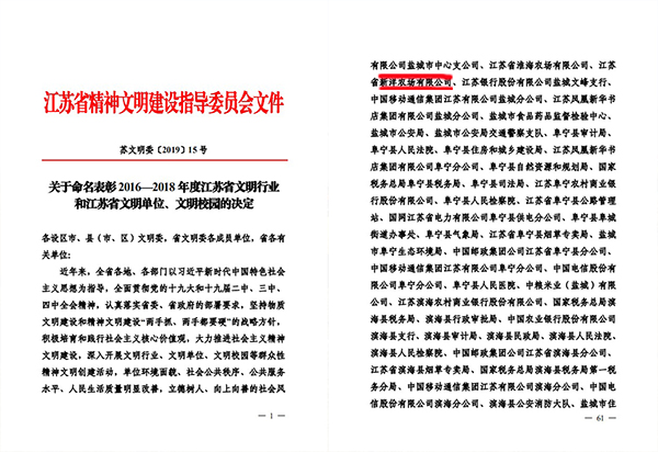 鹽城墾區五家單位獲2016―2018年度江蘇省文明單位稱號
