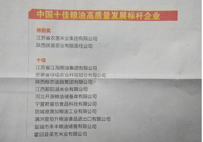 蘇墾米業獲中國“十佳糧油高質量發展標桿企業特別獎”