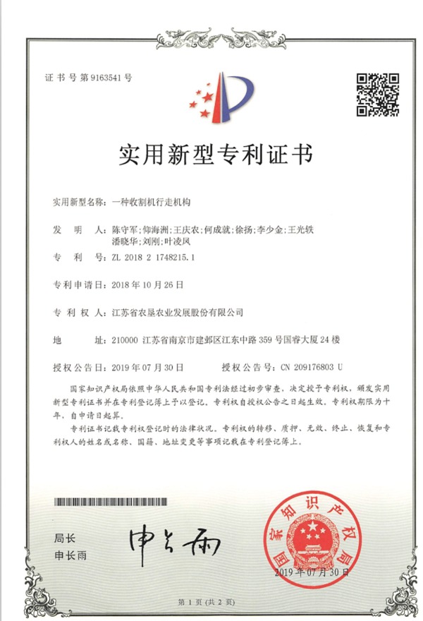 近日,從國家知識產權局獲悉,江蘇省農墾農業發展股份有限公司的“一種收割機行走機構&r