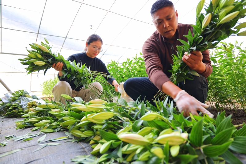 寒冬時(shí)節(jié),崗埠農(nóng)場(chǎng)高效農(nóng)業(yè)示范園11號(hào)大棚內(nèi)一片春意盎然。一株株百合花挺拔站立,不少花苞已露出粉色,在綠葉的襯托下格外嬌艷動(dòng)人。去年,崗埠農(nóng)場(chǎng)高效農(nóng)業(yè)示范園大力發(fā)展鮮切花產(chǎn)業(yè),引進(jìn)了“中國(guó)紅”“索蚌”等百合花品種,共種植14萬株。通過為周邊種植戶提供技術(shù)指導(dǎo),農(nóng)場(chǎng)帶動(dòng)大家發(fā)展鮮切花產(chǎn)業(yè)。圖為工作人員正在整理百合鮮切花。