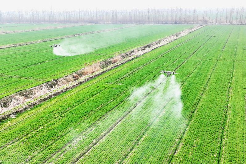 在省農(nóng)墾三河農(nóng)場邱上營分場的麥田里,植保無人機進行飛防作業(yè)。顏懷峰 錢厚紅 攝
