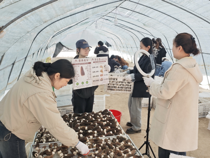 3月25日上午,淮海農(nóng)場新媒體平臺的主播助播通過深入羊肚菌生產(chǎn)和加工現(xiàn)場,借助抖音直播平臺進行產(chǎn)品宣傳、推介,以吸引更多消費者的目光,提升淮?!皦ㄒ淮逼放浦群弯N量。圖為直播人員在菌菇產(chǎn)品加工現(xiàn)場開展直播。