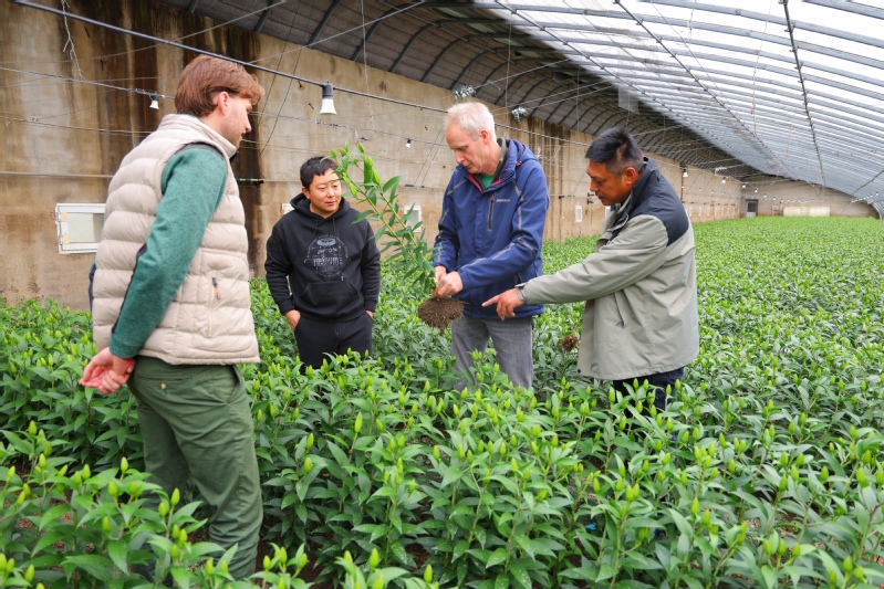 11月23日,荷蘭簡懷特公司資深花卉專家一行走進崗埠農(nóng)場高效農(nóng)業(yè)示范園,深入百合花種植基地,現(xiàn)場指導(dǎo)園區(qū)百合花種植管理工作。