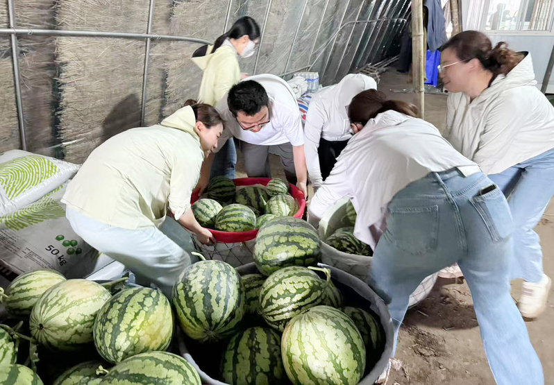 “產(chǎn)業(yè)中心急需支援!”6月12日下午3點(diǎn),東壩頭農(nóng)場工作群消息剛彈出,20多名農(nóng)場機(jī)關(guān)青年已沖向西瓜地。烏云壓頂,一場與暴雨的賽跑就此展開。在6大隊(duì)15號(hào)田地里,青綠的西瓜藤蔓間閃動(dòng)著忙碌的身影。男同志們喊著號(hào)子將沉甸甸的瓜筐抬上三輪車,女同志們抱著10多斤的西瓜接力傳遞?!拜p點(diǎn)放!”“這邊再來一筐!”產(chǎn)業(yè)發(fā)展中心龔玲玲的提醒混著此起彼伏的應(yīng)答聲。此時(shí)的天空已開始飄落淅淅瀝瀝的雨絲,泥水濺上褲腿,汗珠滾落臉頰,54筐西瓜在40分鐘內(nèi)全部安全入倉?!霸蹅冞@速度,能拍動(dòng)作片了!”負(fù)責(zé)裝車的王瑋琦抹著汗笑道。豆粒大的雨點(diǎn)終于砸了下來,這群年輕人相視而笑,沾滿泥點(diǎn)的鞋子在田埂上留下一串深深淺淺的印記。